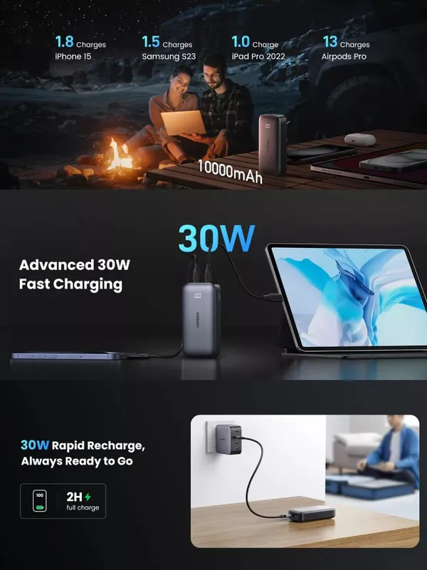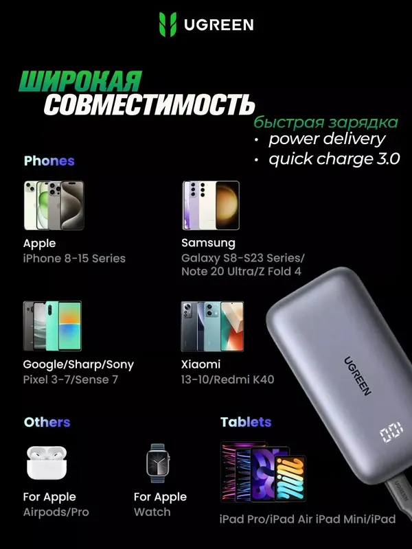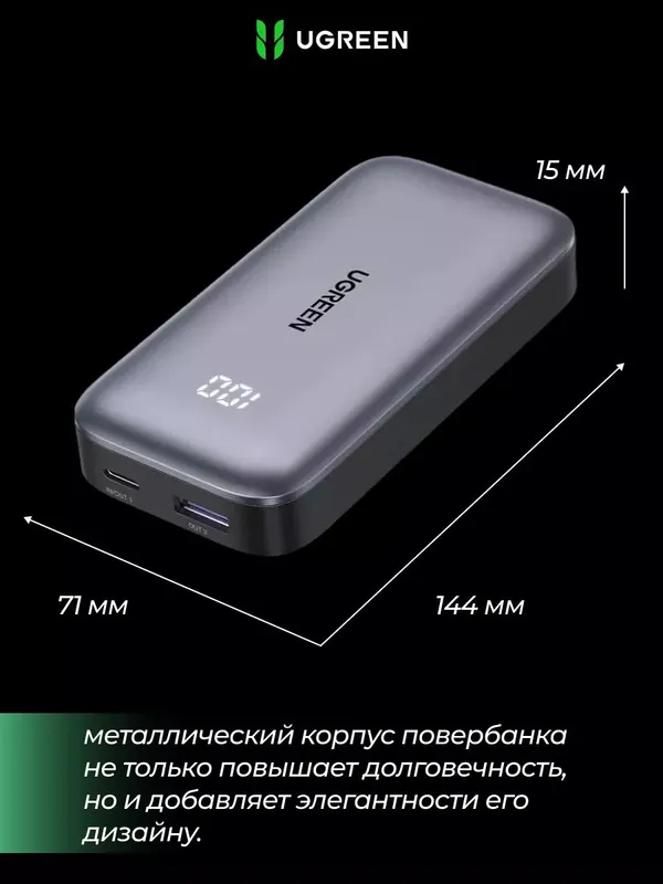 Портативный аккумулятор Ugreen , 10000 мАч, 30 Вт, серый, 25185_