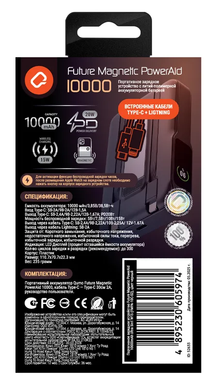 Портативный аккумулятор QUMO Future Magnetic PowerAid 10000mAh Ultra 5in1 W15 черный FMPA-10C-S2