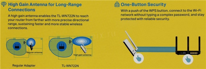 Съемная антенна для удобства установки и возможности подключения более мощных антенн. Поддерживает технологию WI-FI Protected Setup (WPS) и оснащен кнопкой Быстрой настройки защиты (QSS).