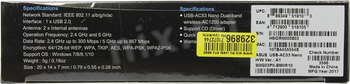 Адаптер беспроводной связи ASUS <USB-AC53> Nano Wireless USB Adapter (802.11a/b/g/n/ac, 867Mbps)