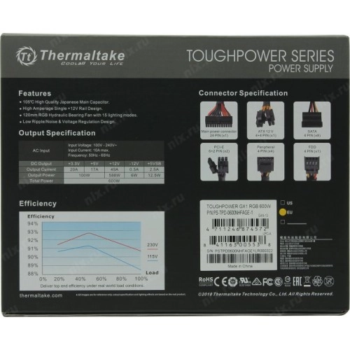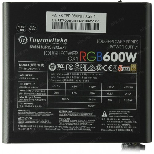 Блок питания Thermaltake Toughpower GX1 RGB 600W (PS-TPD-0600NHFAGE-1) v.2.4, A.PFS, 80 Plus Gold, Fan 12 cm, Retail