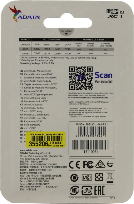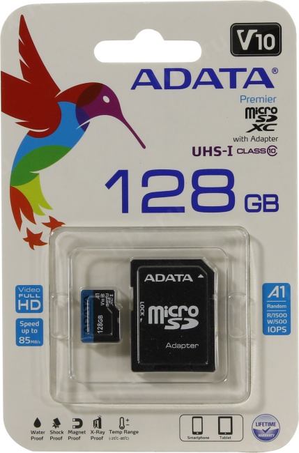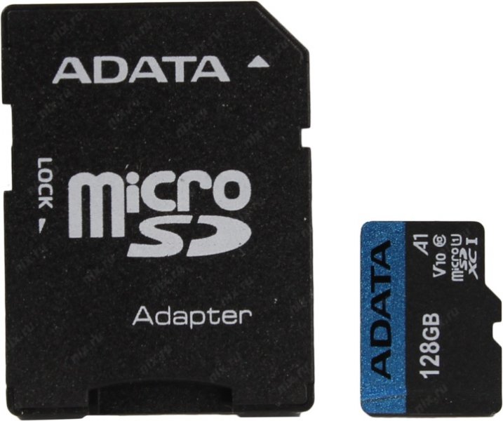 Карта памяти A-Data Premier <AUSDX128GUICL10A1-RA1> microSDXC Memory Card 128Gb A1 V10 UHS-I U1 + microSD-->SD Adapter