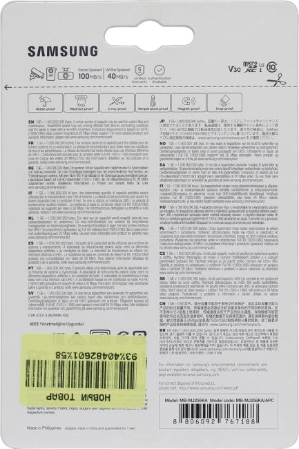 Карта памяти microSDXC с переходником в комплекте. Защищена от влаги, повышенной температуры, воздействия магнитного поля и рентгеновского излучения.