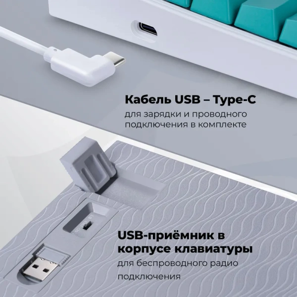 USB кабель для зарядки встроенного аккумулятора, Пинцет для смены клавиш, Комплект сменных переключателей