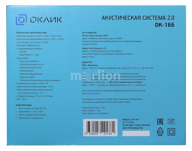 Колонки OKLICK OK-166 Black (2x20W, дерево, Bluetooth) <1112254>