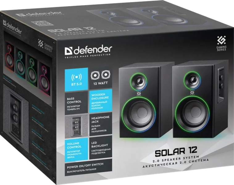 Колонки Defender Solar 12 Компьютерная акустика 2.0, 12 Вт, подсветка, BT, 230В, черная