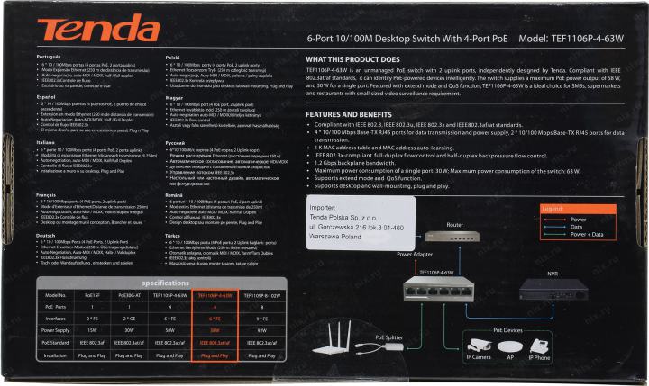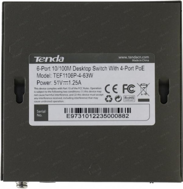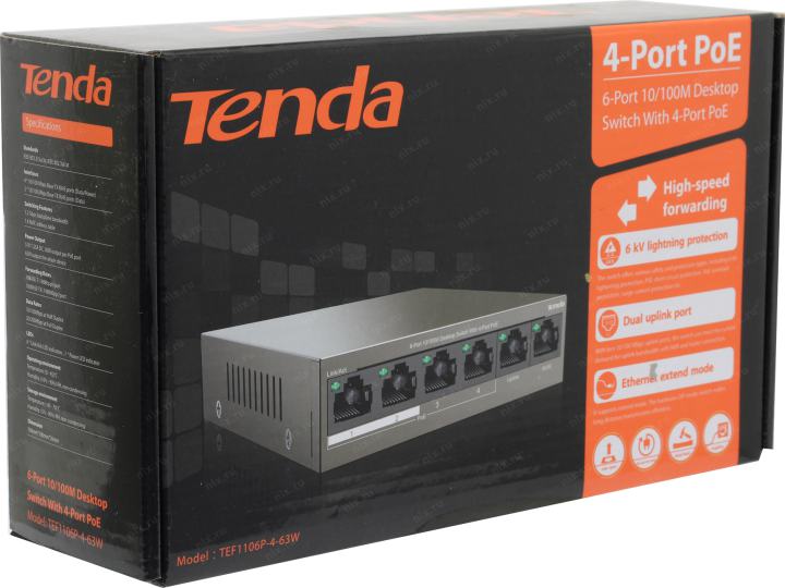 Коммутатор [NEW] TENDA <TEF1106P-4-63W> 6-Port Desktop + 4-Port PoE