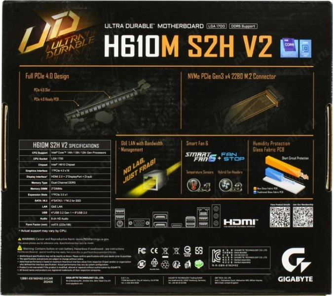 Материнская плата GIGABYTE H610M S2H V2 (RTL) LGA1700 <H610> PCI-E Dsub+HDMI+2xDPGbLAN SATA MicroATX 2DDR5