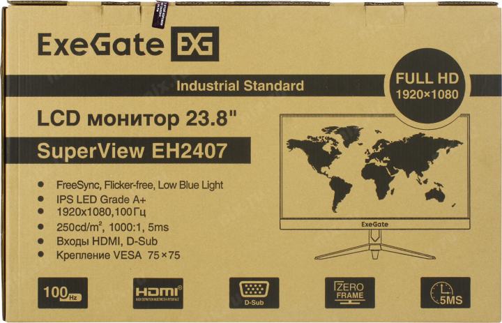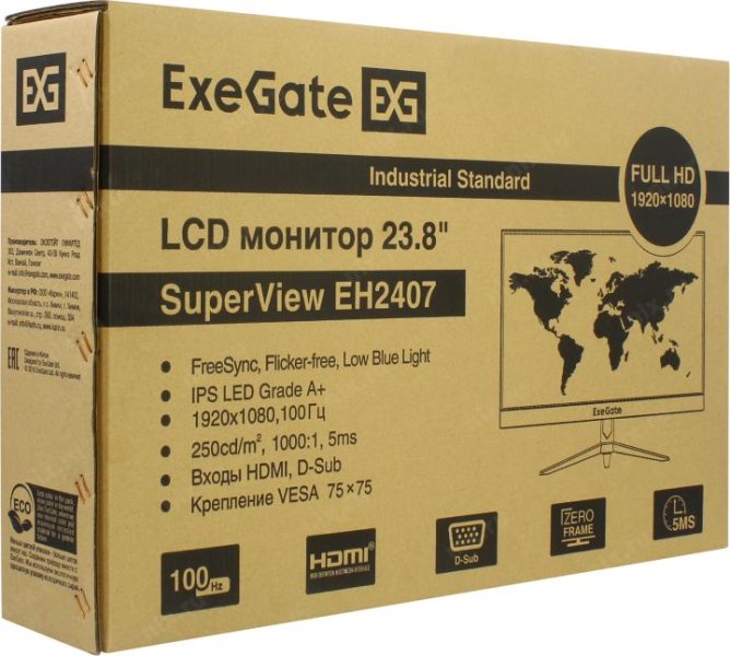 Монитор 23.8" ExeGate SuperView EH2407 черный 100 Гц (IPS LED Grade A+, FHD, 1920x1080@100Гц, 16:9, 250cd/m2, 1000:1, 178°/178°, 5ms, D-Sub, HDMI, Fre