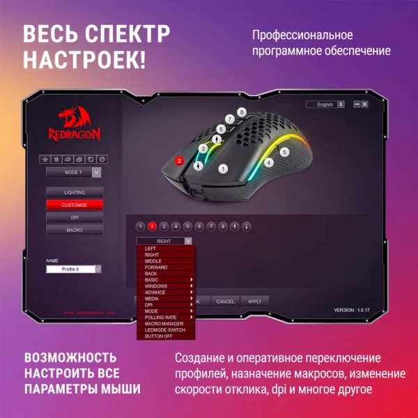 Есть, многоцветная, RGB (16 млн. цветов) подсветка корпуса и колесика
