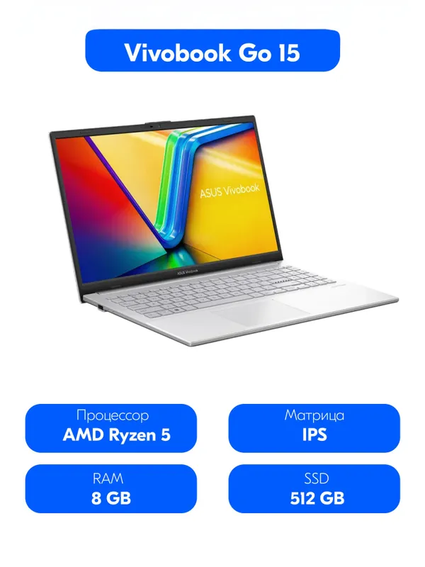 Ноутбук Asus Vivobook Go 15 E1504FA 15.6", AMD Ryzen 5 7520U, 8 ГБ, SSD 512 ГБ, AMD Radeon Graphics, Без ОС, (90NB0ZR1-M03360), серебристый, Русская р
