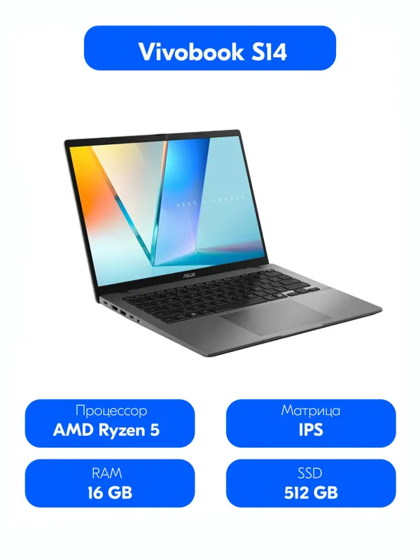 Ноутбук Asus Vivobook S14 M3407HA 14", AMD Ryzen 5 220, 16 ГБ, SSD 512 ГБ, AMD Radeon Graphics, Без ОС, (90NB16E1-M00300), серый, Русская раскладка