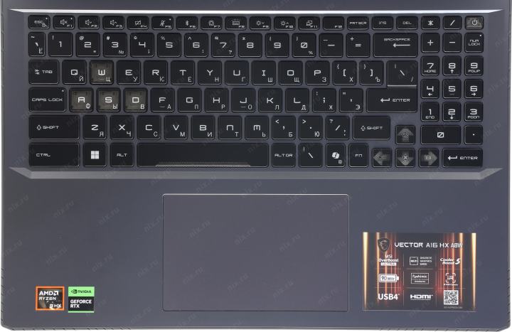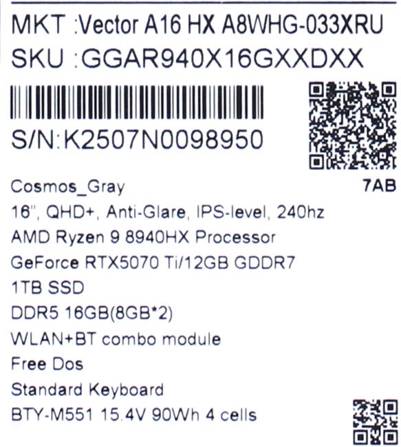 Ноутбук MSI Vector A16 HX A8WHG-033XRU серый AMD Ryzen 9 8940HX/16Gb/SSD1Tb/RTX5070Ti 12Gb/16"/IPS/WQXGA/2560x1600/240Hz/NoOS