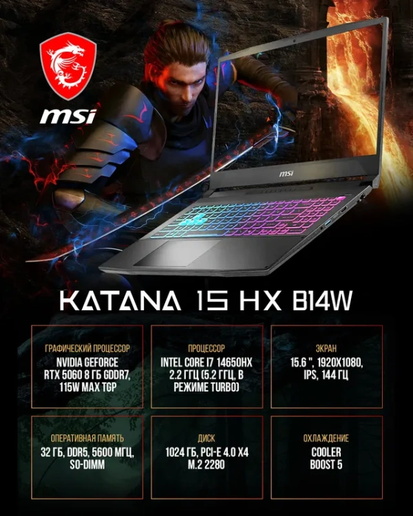 Ноутбук MSI Katana 15 HX B14WFK-804XRU Intel Core i7-14650HX/32Gb/SSD1Tb/RTX5060 8Gb/15.6"/IPS/FHD/1920x1080/144Hz/NoOS/Black (9S7-1587C1-804)