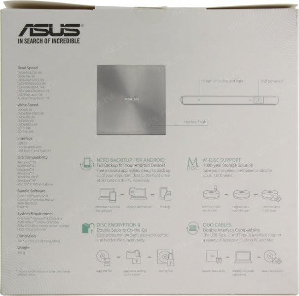 Совместимость с Windows и Mac; Включает два кабеля для интерфейсов USB Type-C и Type-A; Поддержка хранения архивных файлов M-DISC на 1000 лет; Скорость записи 8X DVD; Сверхтонкий 13-мм форм-фактор; Nero BackItUp полное решение для резервного копирования для Android-устройств.
