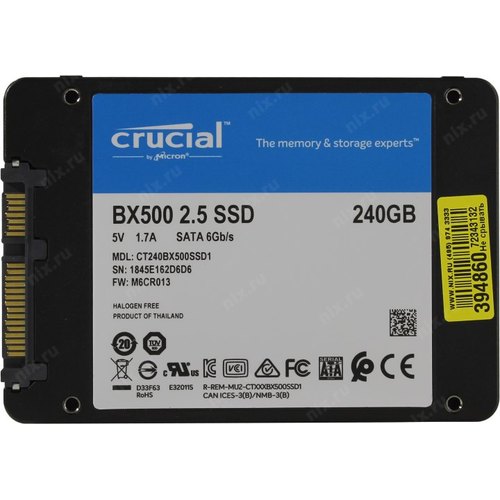 Твердотельный накопитель (SSD) 240 Gb SATA 6Gb/s Crucial BX500 <CT240BX500SSD1> 2.5" 3D TLC