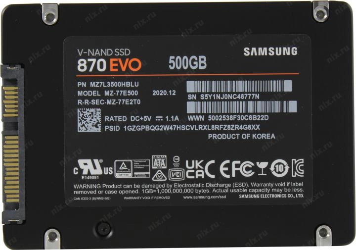 Твердотельный накопитель (SSD) 500 Gb SATA 6Gb/s Samsung 870 EVO <MZ-77E500BW> (RTL) 2.5" V-NAND 3bit-MLC
