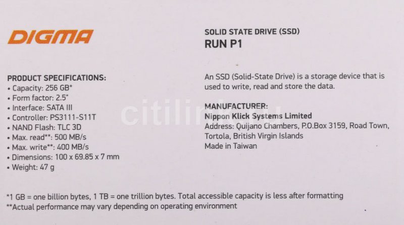 Твердотельный накопитель (SSD) Digma 256Gb SATA3 DGSR2256GP13T Run P1 2.5"
