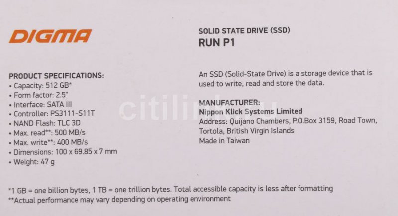 Твердотельный накопитель (SSD) 512 Gb SATA 6Gb/s Digma RUN P1 <DGSR2512GP13T> 2.5" 3D TLC <1626608>