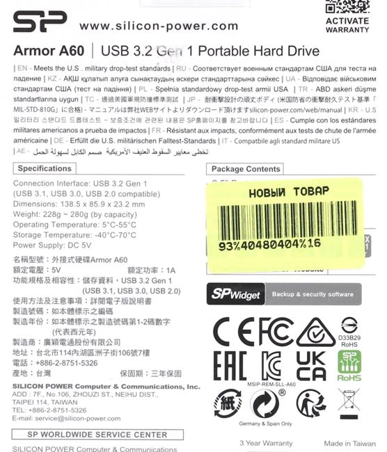 Внешний твердотельный накопитель (SSD) Silicon Power <SP020TBPHDA60S3A> Armor A60 USB3.2 Portable 2.5" HDD 2Tb EXT (RTL)