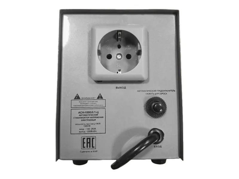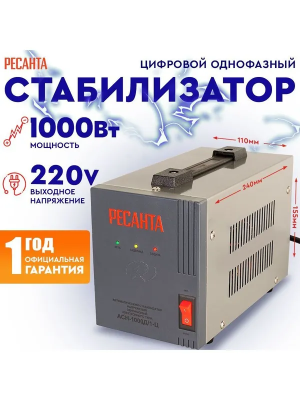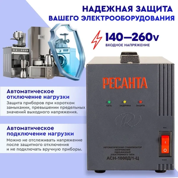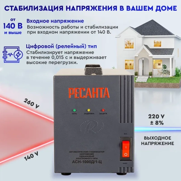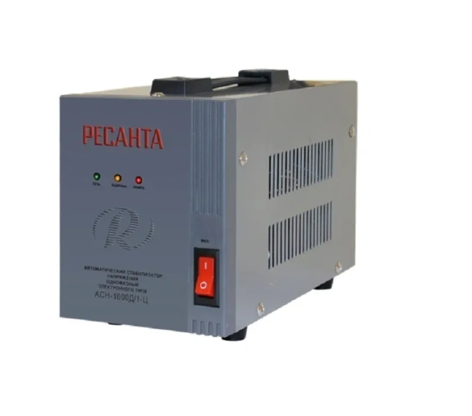 Стабилизатор напряжения Ресанта АСН-1000Д/1-Ц предназначен для поддержания стабильного напряжения сети и питания электроприборов бытового назначения 220В, 50 Гц. Колебания напряжения в сети выше допустимых норм приводят к отрицательным последствиям для электрооборудования. Стабилизатор Ресанта АСН-1000Д/1-Ц предназначен для обеспечения качественной работы различных бытовых устройств в условиях нестабильного по значению напряжения в сети. Данная серия разработана в соответствии с международными стандартами для защиты подключенных устройств от аварийных скачков электроэнергии. Серия АСН-1000Д/1-Ц относится к релейному типу стабилизаторов, обеспечивающих ступенчатое регулирование выходного напряжения с высокой точностью его поддержания. Предназначен для работы в условиях климата с диапазоном рабочих температур от -10 до +40°С и относительной влажности не более 80%
